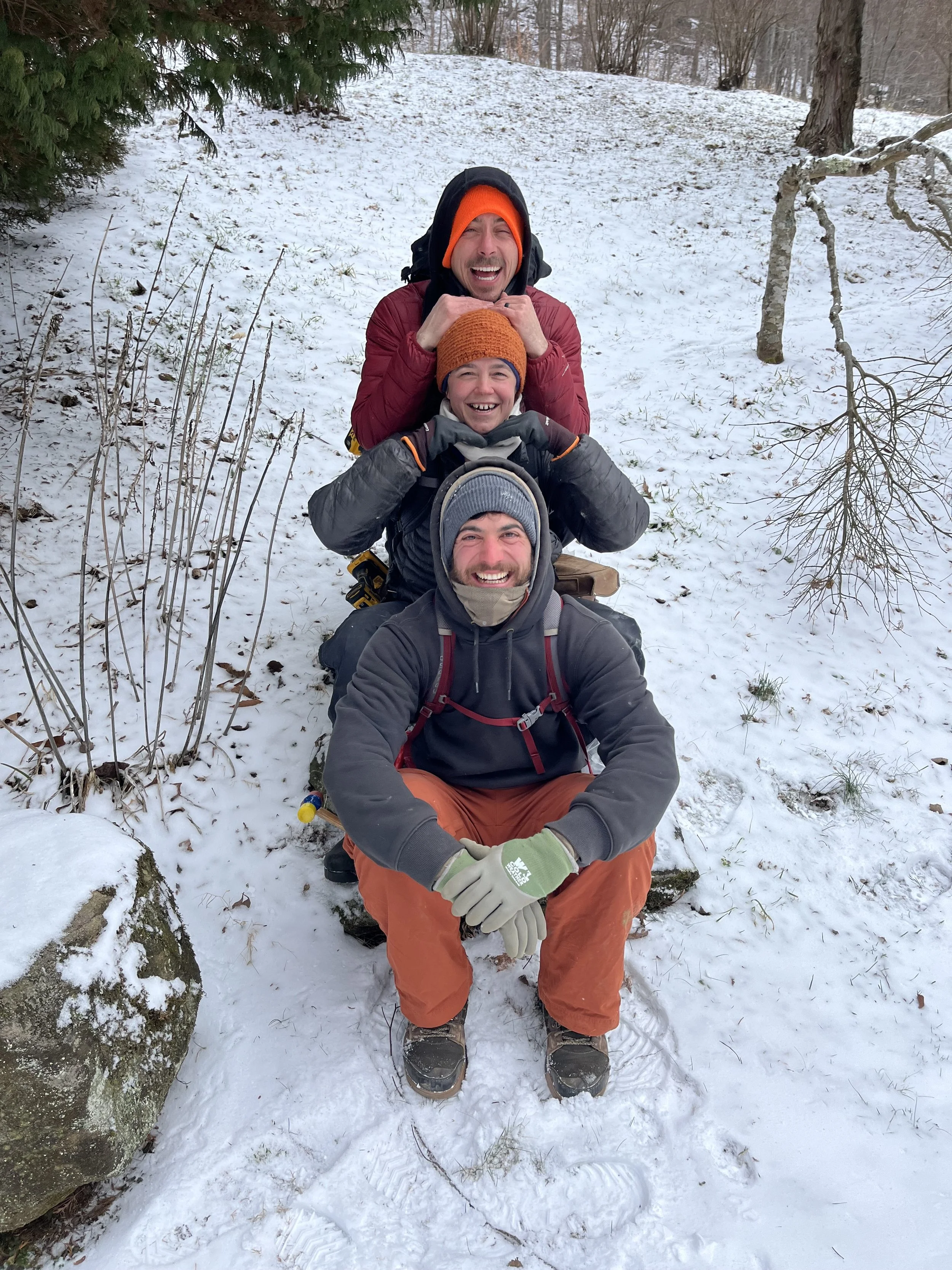 Despite the winter weather, our spirits were high as we worked. The mood is always buoyant when we work with Jason. Our banter spins endlessly around puns and dumb jokes that keep us laughing through the work. By the time we paused for group photos—commemorating the tapping crew for the year—we were completely punch drunk on cold, laughing hysterically at a joke that wasn’t even funny. That effervescence carried us through the day.